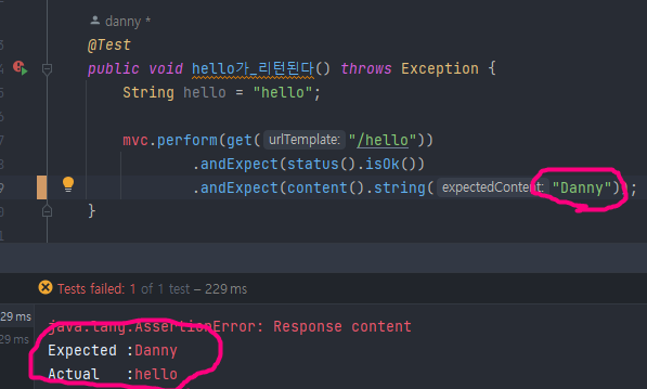 만약 리턴값 검증을 Hello가 아닌 다른 값을 넣는다면?
