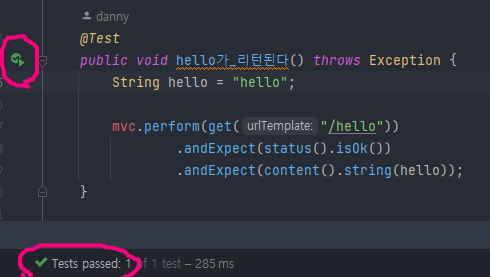 - Controller에서 "hello"를 리턴하기 때문에 이 값이 맞는지 검증