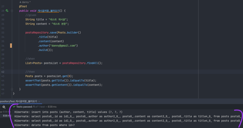- application.properties파일에 spring.jpa_show_sql=true 옵션 추가시에 테스트후 콘솔에서 쿼리 로그 확인 가능