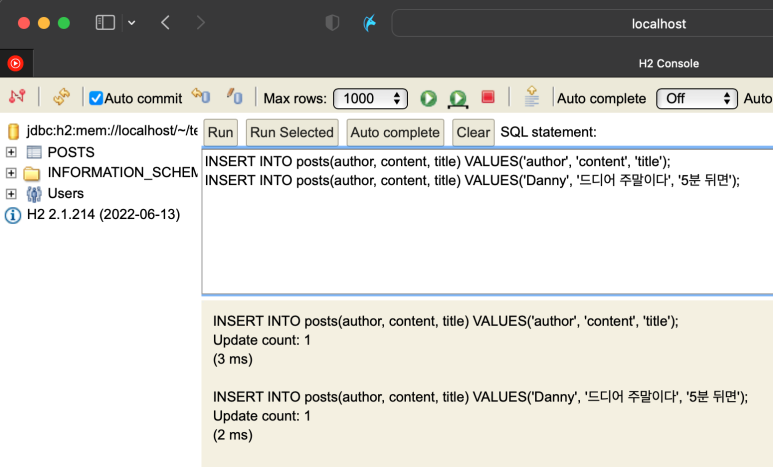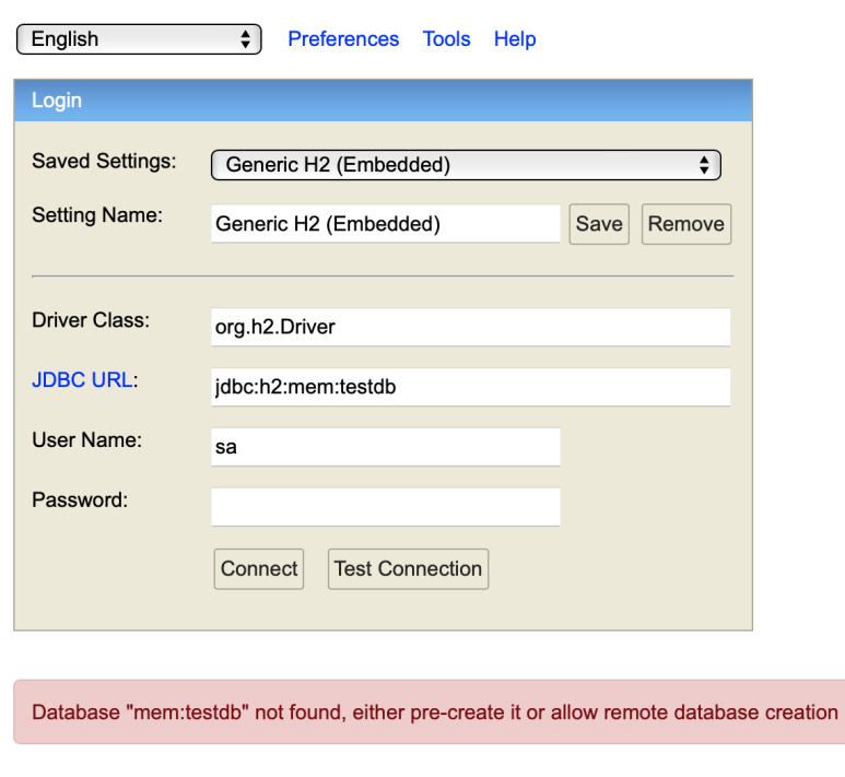 교재에서는 JDBC URL에 "jdbc:h2:mem:testdb"를 입력하라고 했는데