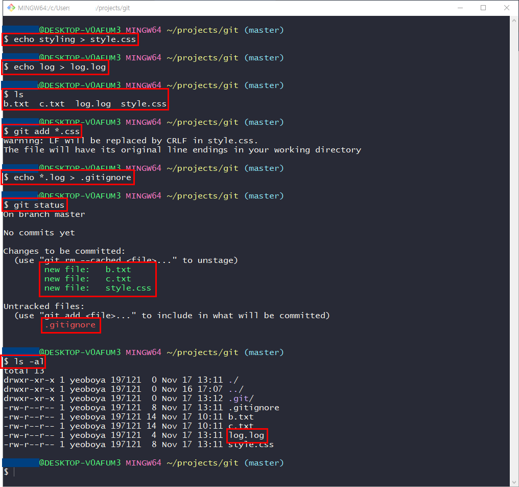 - git status로 확인해 보면 style.css는 정상적으로 staging area에 올라가고 더이상 log.log는 트래킹 되지 않음