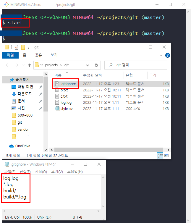 - start . 으로 현재 디렉토리를 열고 .gitignore파일을 메모장으로 열었음