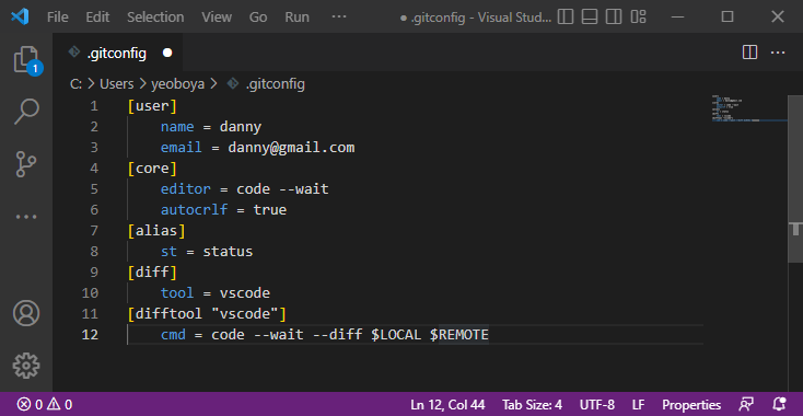 - [diff] tool = vscode -- diff의 tool로 vscode를 사용 함