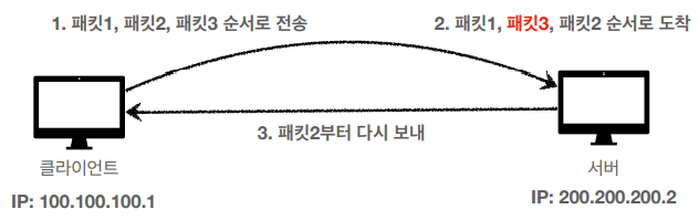 - 서버측에 도착한 패킷이 순서대로 오지 않았다면 해당 패킷부터 재전송 요청