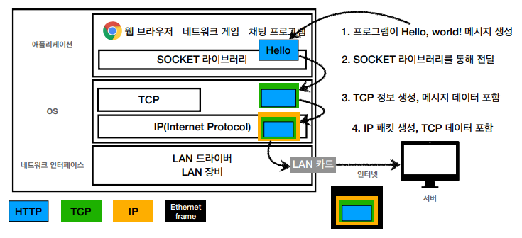 - 애플리케이션 계층에서 SOKET 라이브러리를 통해서 OS 계층에 메시지 데이터를 넘김