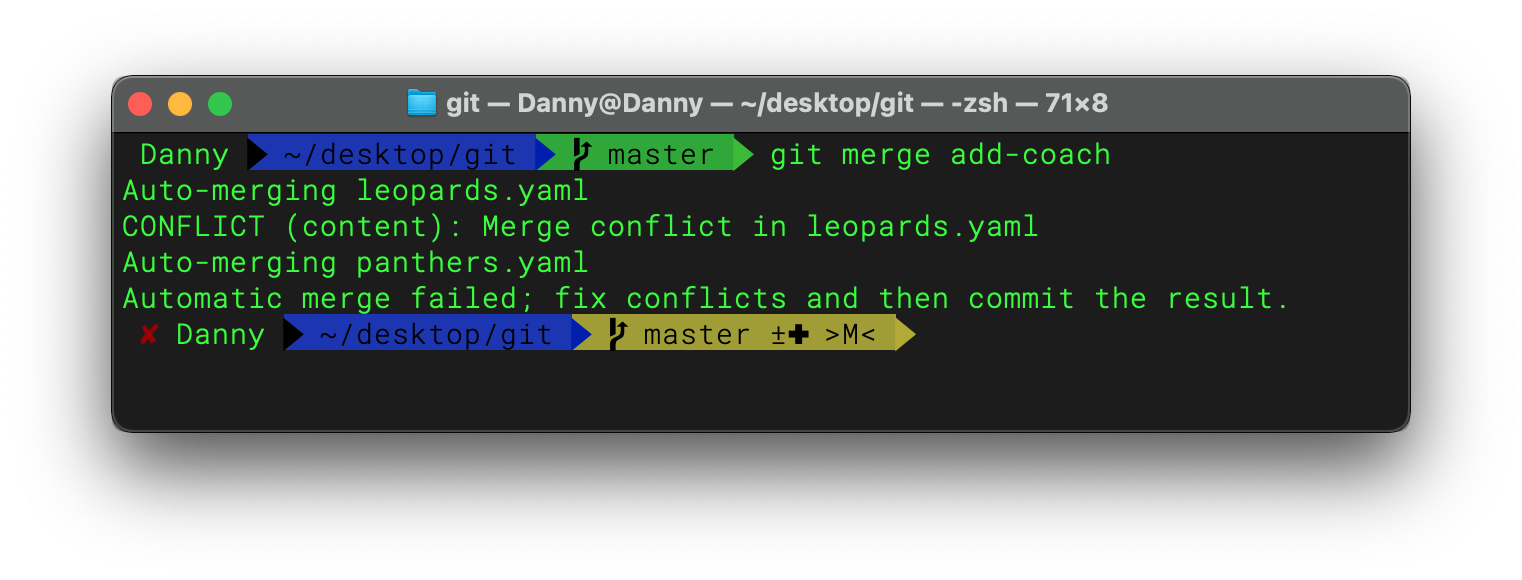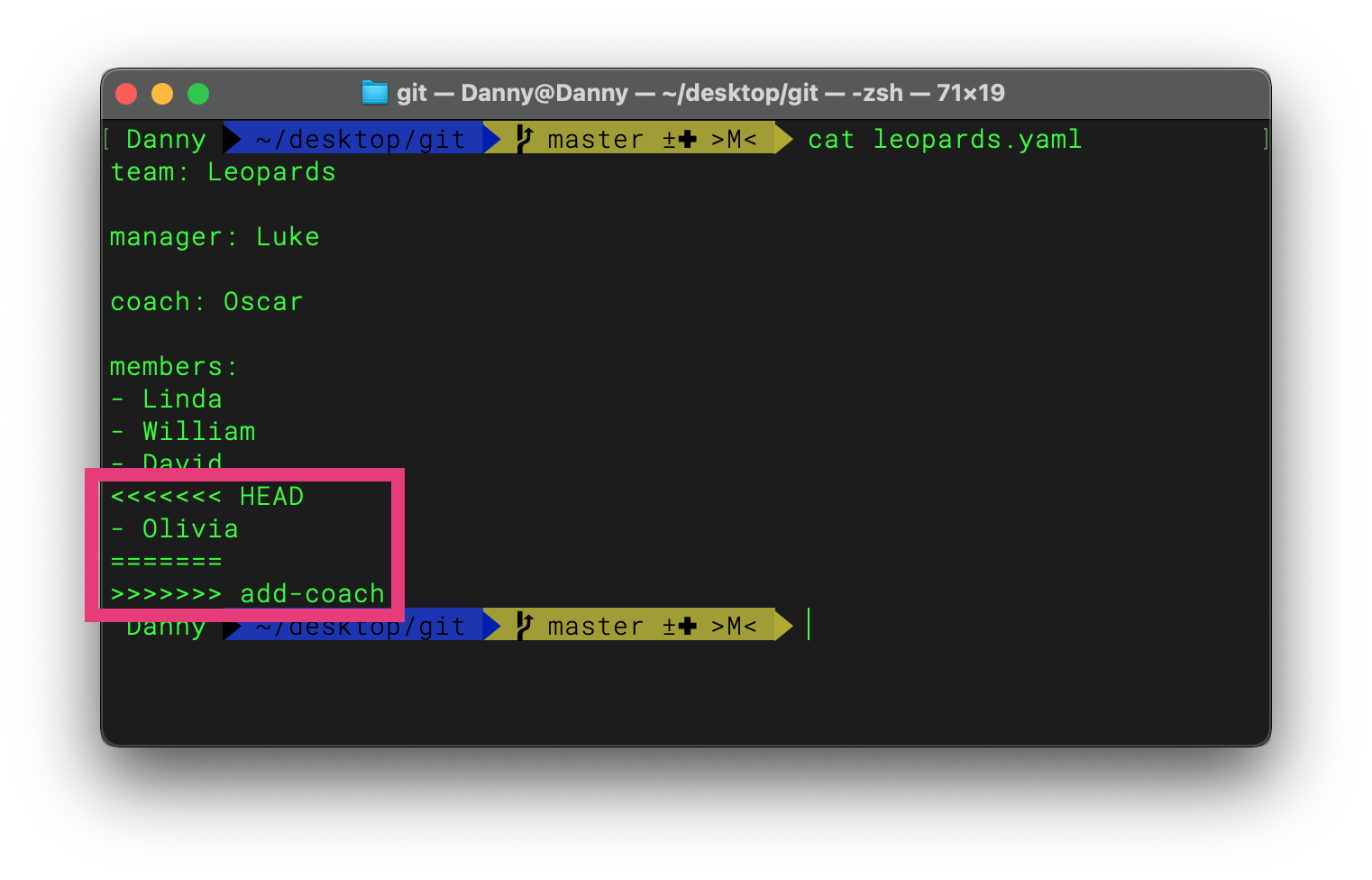 - 터미널로 Git merge를 하는 중에 충돌이 생겼음