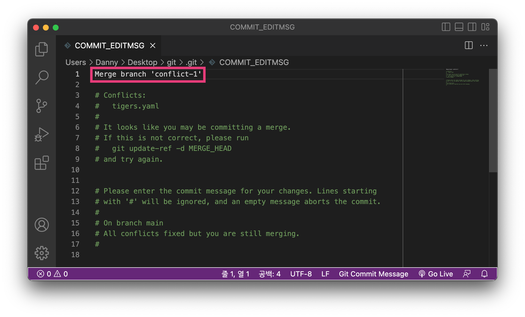 - commit 후 Editer가 열리고 자동으로 commit 메시지가 'Merge branch 'conflict-1'으로 되있음