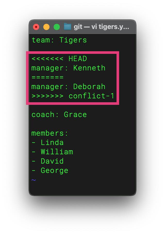 - conflict-1의 Deborah부분을 지우고 현재 Branch의 수정부분만 남김