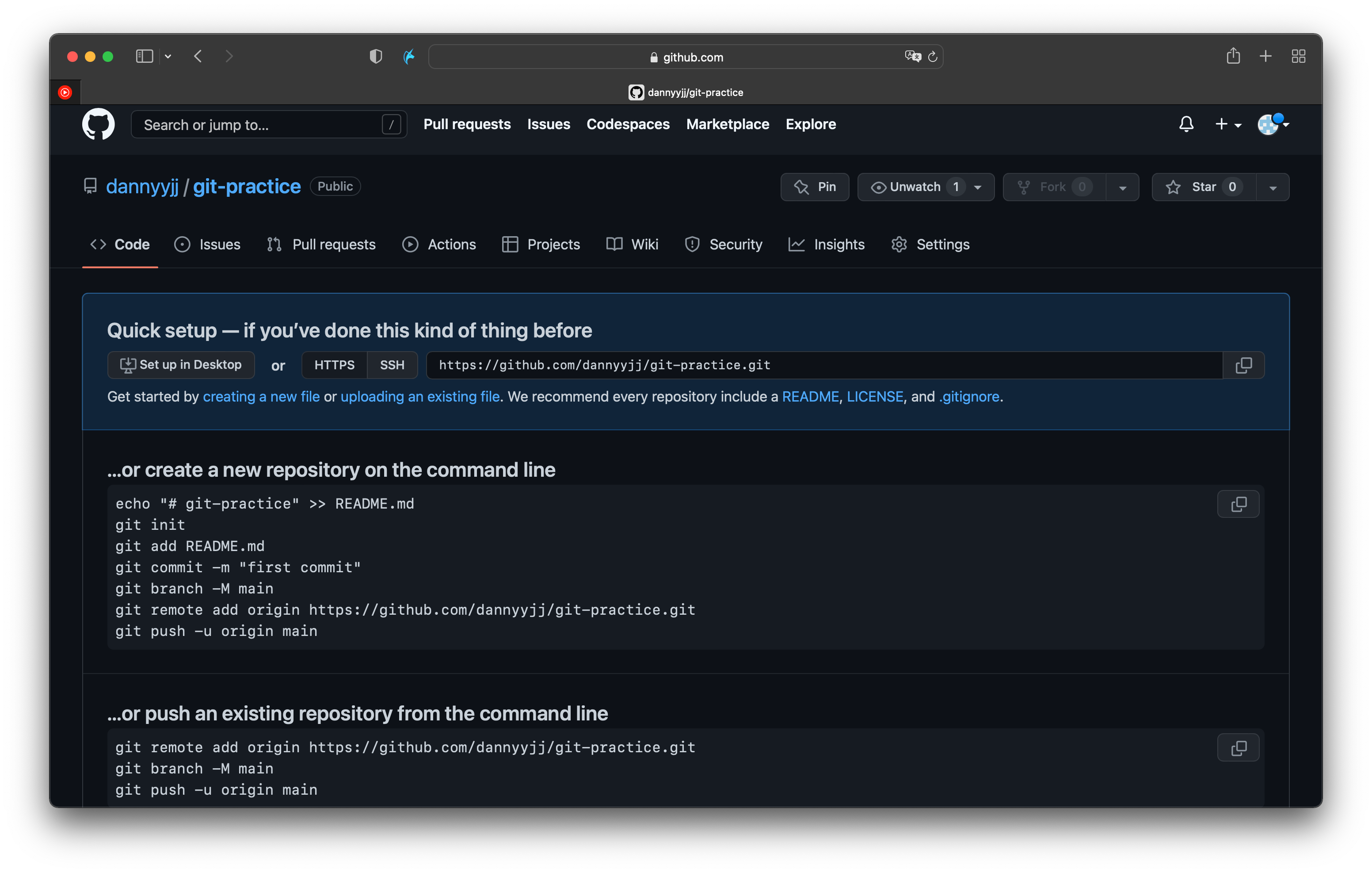 - 일단 이 부분을 넘기고 진행한 다음 push 명령어 ( 다음 페이지 세 번째 명령 ) 사용시 터미널에서 토큰(패스워드)을 입력하라고 요구